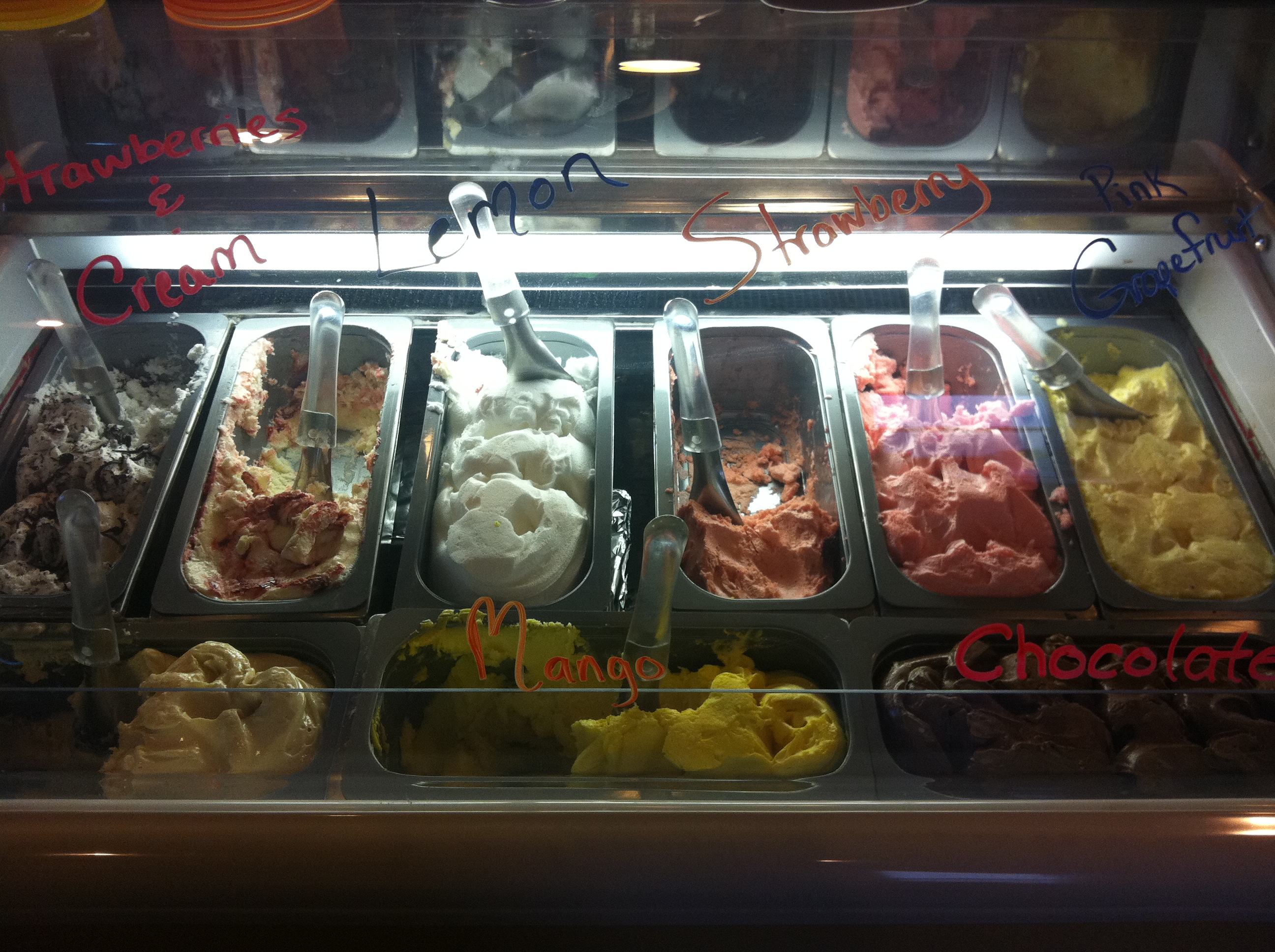Once inside, it was obvious I had missed out. Not only do I love frozen treats and am forever searching out the best homemade ice cream options around, this place is probably two miles from my house. The interior is very cute – warm colors, red paint, markerboard menus, comfy furniture, and friendly baristas ready to chat while you sample gelato from the case. Check out the selection: