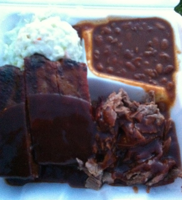 Instead of getting the rib “sampler” – i.e. 3 ribs for $7 (?!!) we opted for the Alamo platter, which gives you sampler of two meats, and also choice of two sides. So for $14, we ended up with 3 ribs, a generous helping of brisket, cole slaw, and “side kicks ranch” baked beans.
