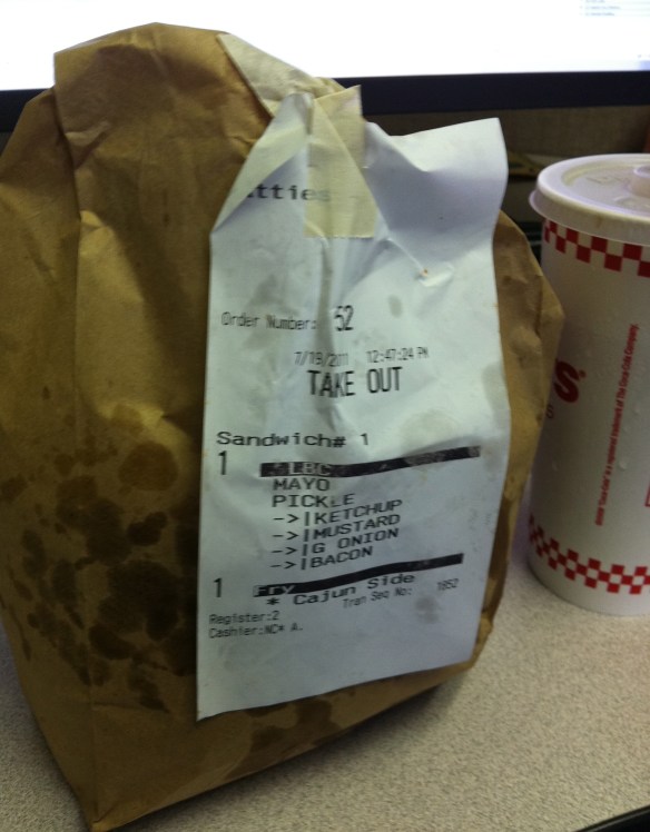 1. The greasy bag reminds me of the greasy bag that was handed to me at Brown Bag Burgers on Dressler. No stars for that place either – – in my opinion. Thanks for the tip, I was thinking of trying the Five Guys – now I know not to waste my time or hard-earned money.