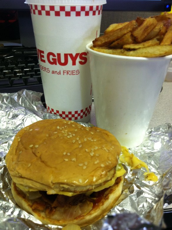 So the order consists of: single bacon cheeseburger, fries, and a drink.  Imagine my surprise when she gave me the total: $10.09.  WTF, are they insane?!  The only thing they haven’t knocked off is the price.  I mean, COME ON, this is a fast food burger joint, what am I missing?  Apparently Five Guys is the Starbucks of the burger world and I just ordered a $5 cup of coffee.