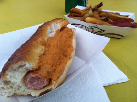 But enough with the cars, let’s get to the food. After much walking and menu-hunting, we finally decided on a hot dog truck. But this wasn’t just any hot dog stand – they were serving up Chicago dogs, Coney dogs, and a slew of other varieties including this gem:
