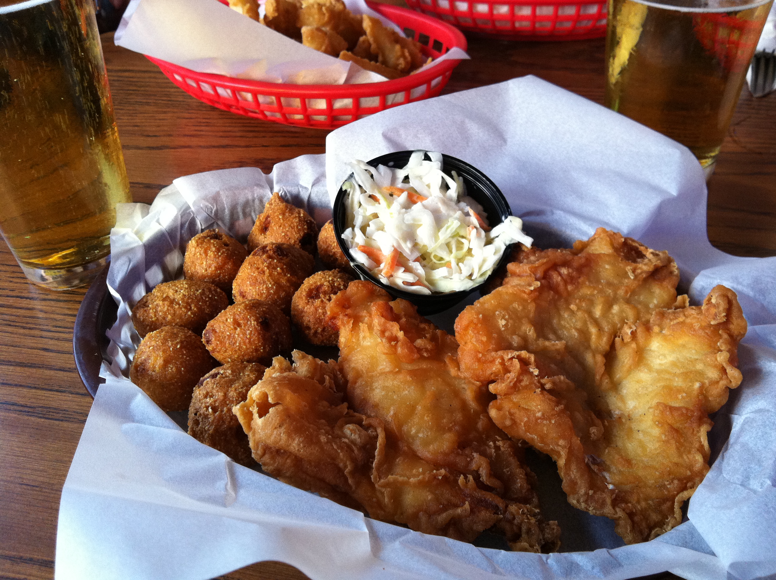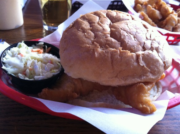 Dave’s fish dinner came with three generous pieces of beer-battered fish and a whole bunch of hushpuppies. So glad we tried the hushpuppies, they were great – well seasoned, very tasty, especially dipped in one of the sauces, a horseradish chipotle mayo. Excellent combination!