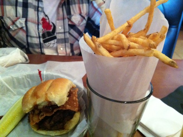 Hanging above the pass-through to the semi-open kitchen is a graphic of a cow, whose various “areas” are covered with names of counties in northeast Ohio.  Very clever, as are the names of the different burgers on the menu – apart from being artistic, creative, and original in their use of non-traditional burger toppings, they all have quirky names.  Personal favorite name: Crouching Tiger: Hidden Bacon, a beef patty topped with bacon, pork shoulder, crispy wonton, and special sauce, shown here: