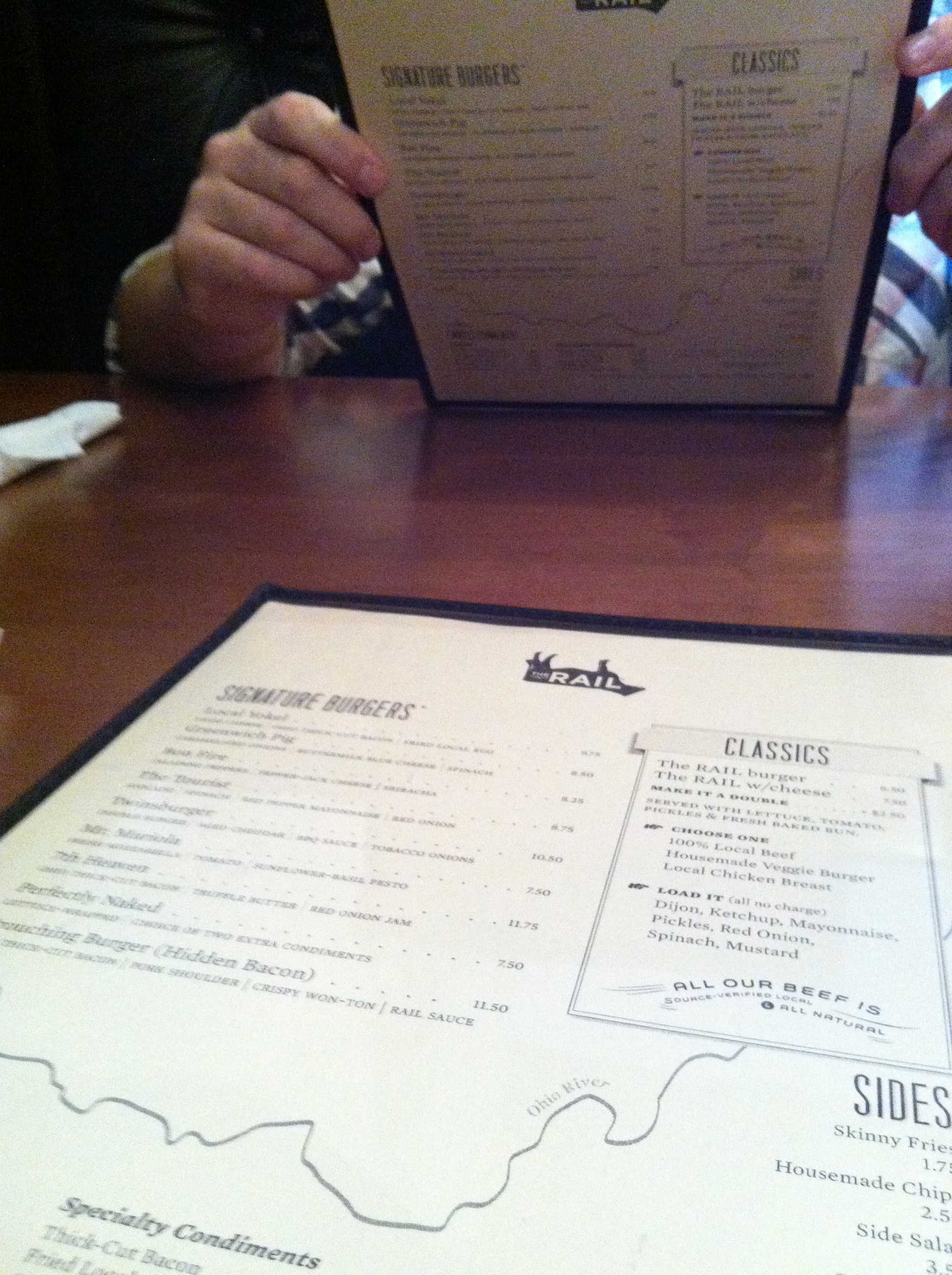 The Rail gets major credit for the amount of time and energy that was obviously spent on branding, something that often gets the cold shoulder from restaurateurs in this area.  But this does not go unnoticed, especially for people like us, whose first impression is made on the website almost as often as the front door.  This was especially true with The Rail, since I learned about it from a fellow foodie’s recommendation – of course the first thing I did was go to the website to check out the menu.  The Rail’s website does a great job of conveying the message: local burgers made with Ohio beef.  Simple and unpretentious, but also very informative; one trip to the website told me that this place was oozing with style.  Plus, it made me hungry.