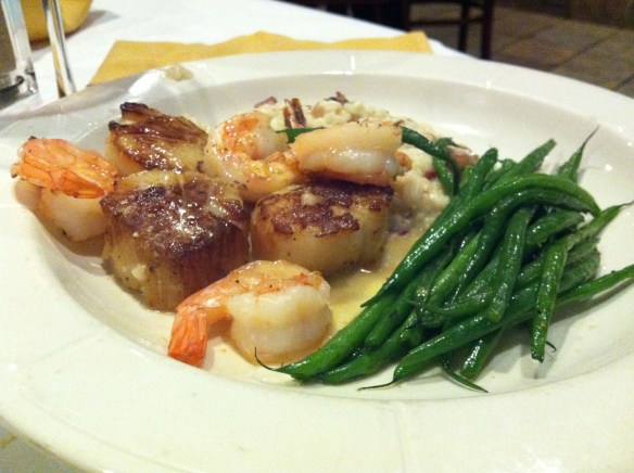 For his entree, Dave ordered what I wanted (how dare he!), the pan-seared scallops and grilled shrimp with apple bacon scallion risotto.  (I’m a sucker for scallops and risotto.)  But of course I couldn’t order the same thing; that would be crazy since I can obviously just eat his. The lightly-browned scallops and shrimp were tasty, but the risotto was fabulous – clearly the most memorable thing on the plate.