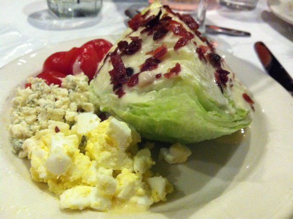 Bricco did an excellent job of preparing their Restaurant Week menu (above).  As you can see they offered two price levels, with multiple selections for each course on each level.  Now typically we order pizza at Bricco.  They have many wonderful combos of non-traditional pizza toppings, and they are all artfully prepared and baked in a woodfired oven.  Can’t really go wrong with any of them, and there’s something for every taste.  But tonight, we decided to change it up a bit and try something new.  First, I had to start with the wedge salad.
