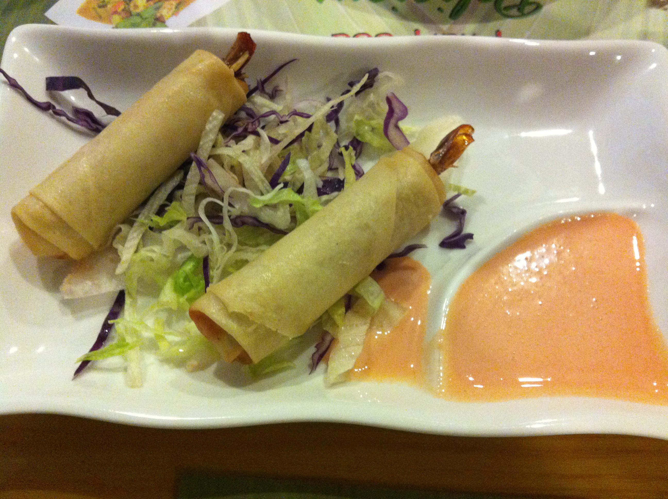 Pictured above are the tiger prawn spring rolls.  I expected the non-fried variety served cold in rice paper wraps.  So these weren’t exactly what I pictured, but they were very enjoyable anyway – crunchy and flavorful with the spicy-sweet sauce on the side.