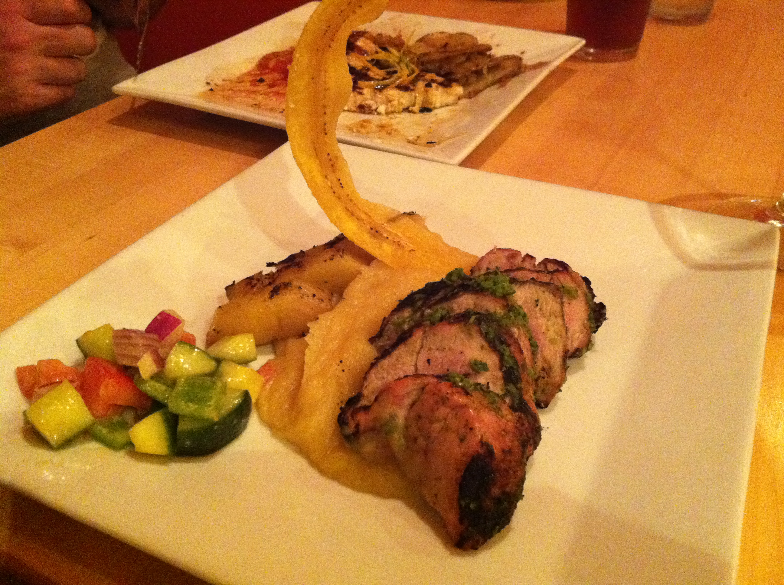 A short while later, our server apologetically delivered my meal, which was a Cuban dish of grilled pork loin with pineapple and white sweet potato puree. This dish was excellent also. The pork was cooked perfectly – blackened on the outside but just slightly pink in the center. The sweet potato puree was very smooth, almost to an airy consistency. And the charred pineapple brought in a welcome twist. The plating was beautiful, but not so “fancy” as to sacrifice portion. Both of our meals were filling, without being gratuitously over-sized.
