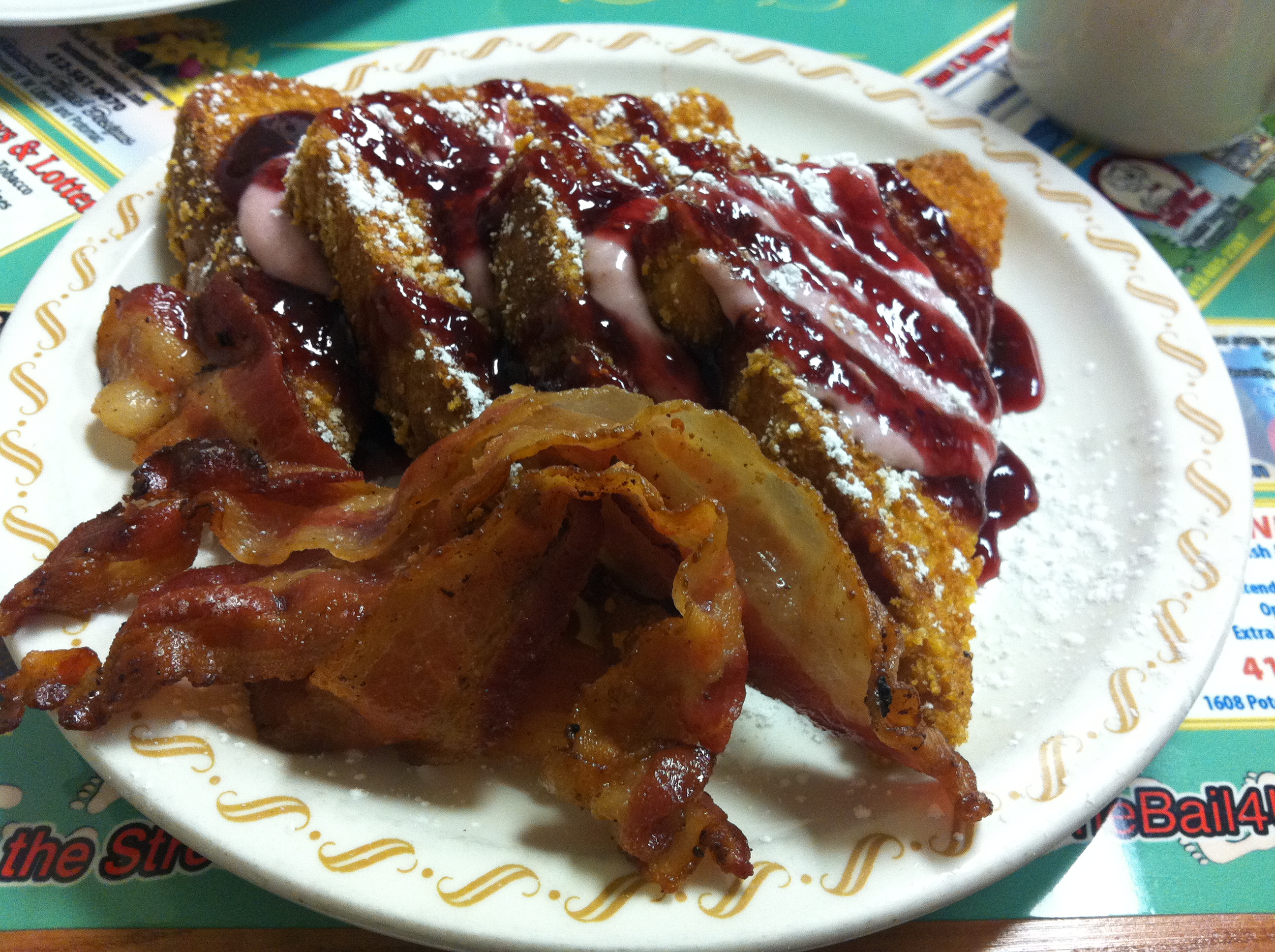 After purusing the menu for a time, and doing my usual “savory vs. sweet” inner debate that inevitably happens at breakfast, I decided to go with my gut (ha) and ordered the raspberry stuffed fresh toast with a side of bacon.