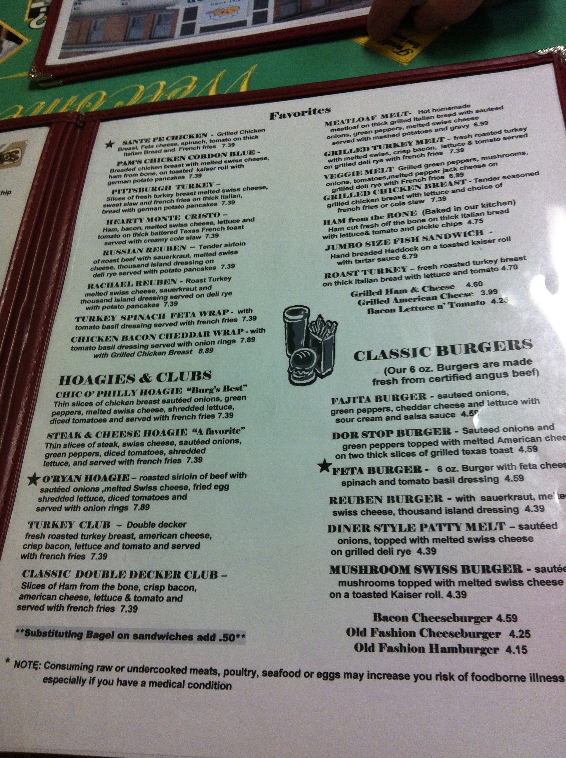 After reading some stellar reviews on the Spoon, and also noticing that the place was featured on “Diners, Drive-ins and Dives” we decided to give the Dor-Stop a try. Turned out to be a fun adventure up into the hills of Pittsburgh to the adorable town of Dormont. Inside was a charming, down-to-earth, bustling diner, with a semi-open kitchen and hungry locals buzzing about. My taste buds were intrigued.