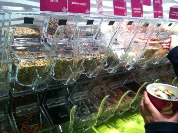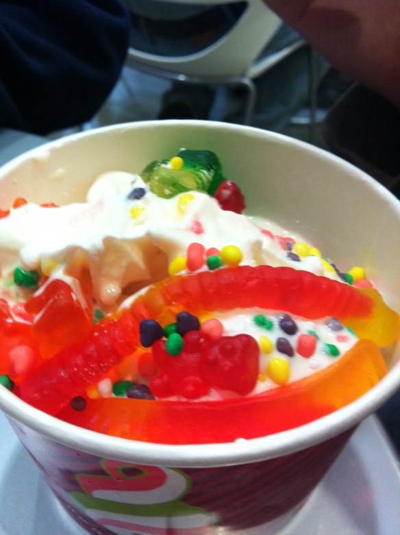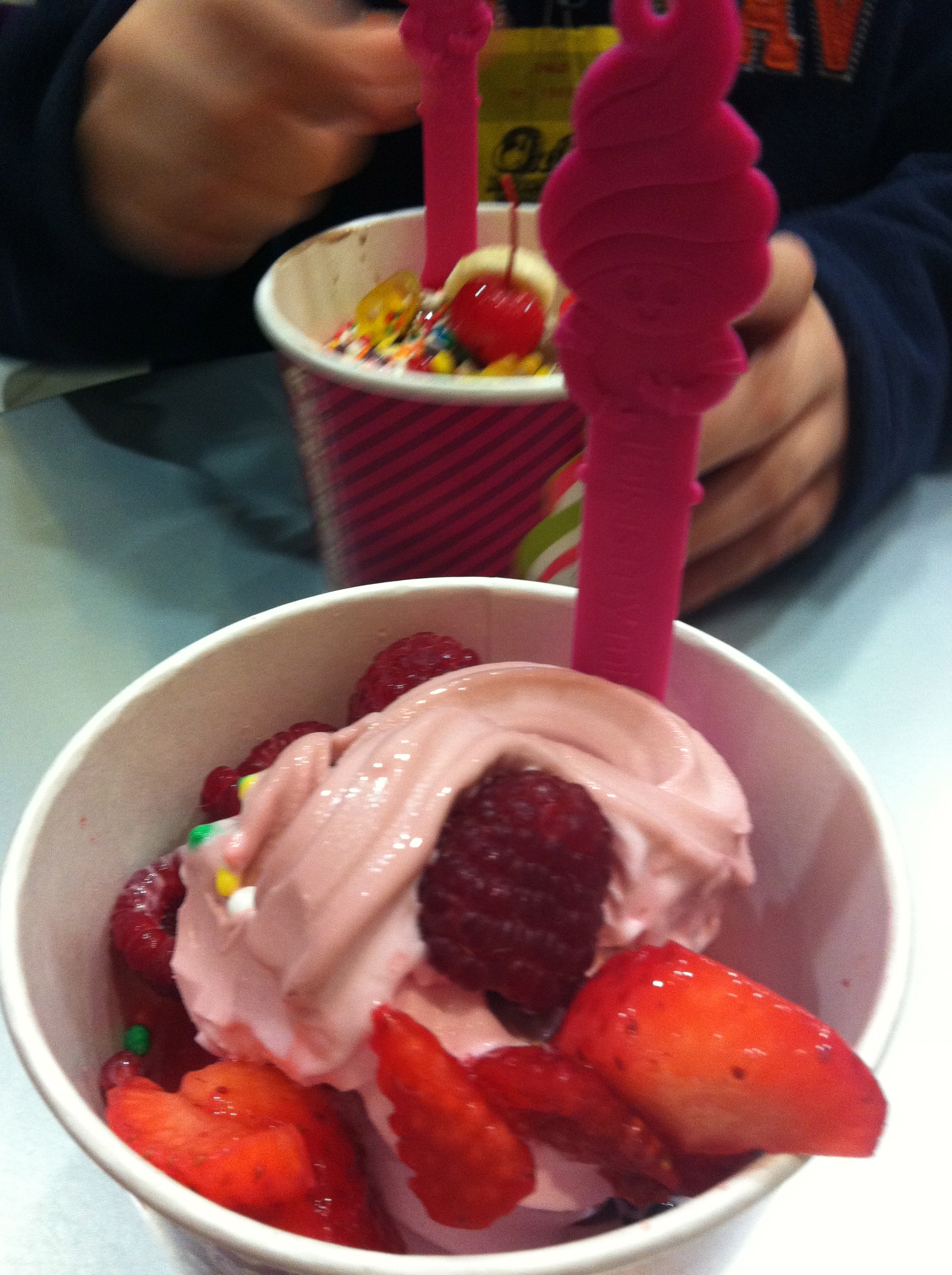 Following the fruit bar is one more opportunity to blow the good choices you’ve made so far, with a collection of hot toppings, like hot fudge, chocolate, even marshmallow sauce.  After that, voila!  You’re done and ready to pay!  Thankfully they charge by the ounce (45 cents) which means that no matter what you’ve selected at the bar, you still pay the same price.  Yes, this isn’t the cheapest experience – for the five of us, it ended up being over $20.  Buuuuut, it is fun, and for most responsible adults, a few ounces would probably be more than satisfying.