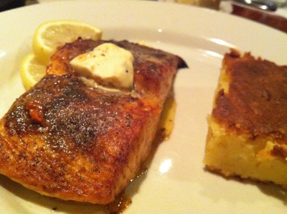 Almost forgot to mention that they do ask what temp you would like the salmon prepared. I went with medium well, thinking that I wanted it cooked, but not to death. Later I remembered that so many salmon dishes end up overcooked, which for me kills it, so I panicked thinking I had made a bad choice. However, this salmon was cooked to absolute perfection. It was moist, flavorful, light….couldn’t have asked for more. The red pepper butter was just right, adding a nice hit of seasoning, without overpowering the wonderful salmon flavor. One squeeze of citrus and I was in heaven. On the right you see the corn cake – like I said, it’s my favorite, that is until I tasted this salmon!