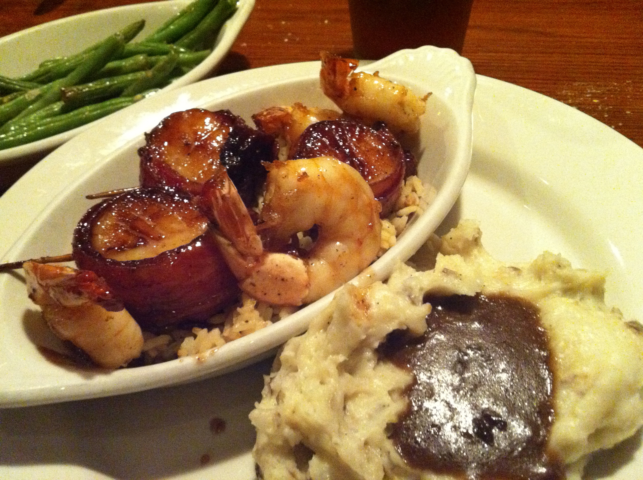 I just noticed that DZ starched it up with both rice and mashed potatoes – this made for an absolutely humungous meal. The shrimp and scallops were lightly covered in a maple glaze which added an interesting element to the dish, and really, who doesn’t love a bacon-wrapped scallop. I must confess though that, while tasty, this dish did not compete with the salmon. This was one of the better salmon preparations I’ve had, ever. The other outstanding prepared salmon experience that comes to mind was at Hash House in San Diego, where the salmon is cooked with a sweet and spicy barbeque that is absolutely to die for.