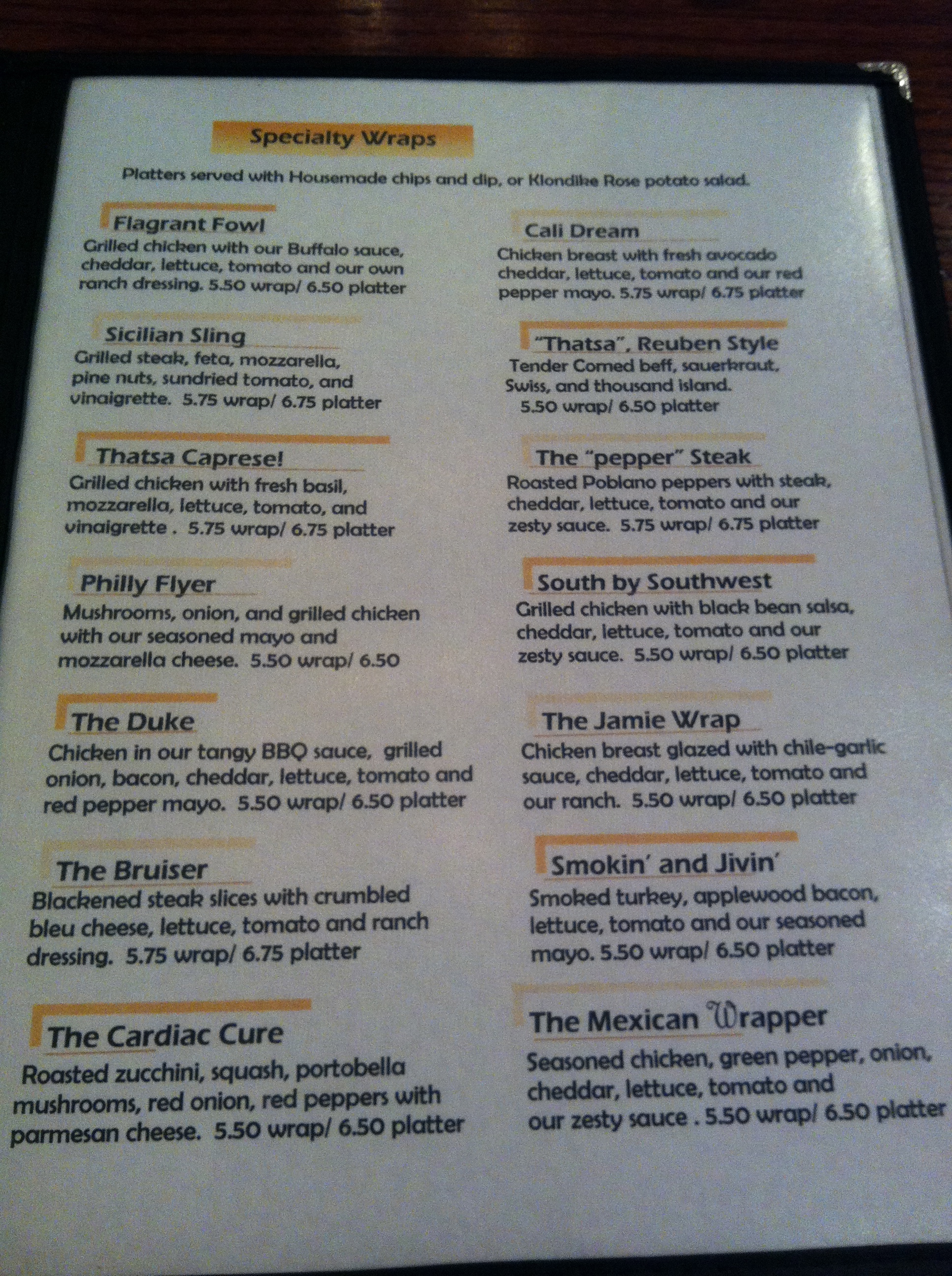 The menu, not surprisingly, is centered around the latest health-food sandwich-alternative, the wrap.