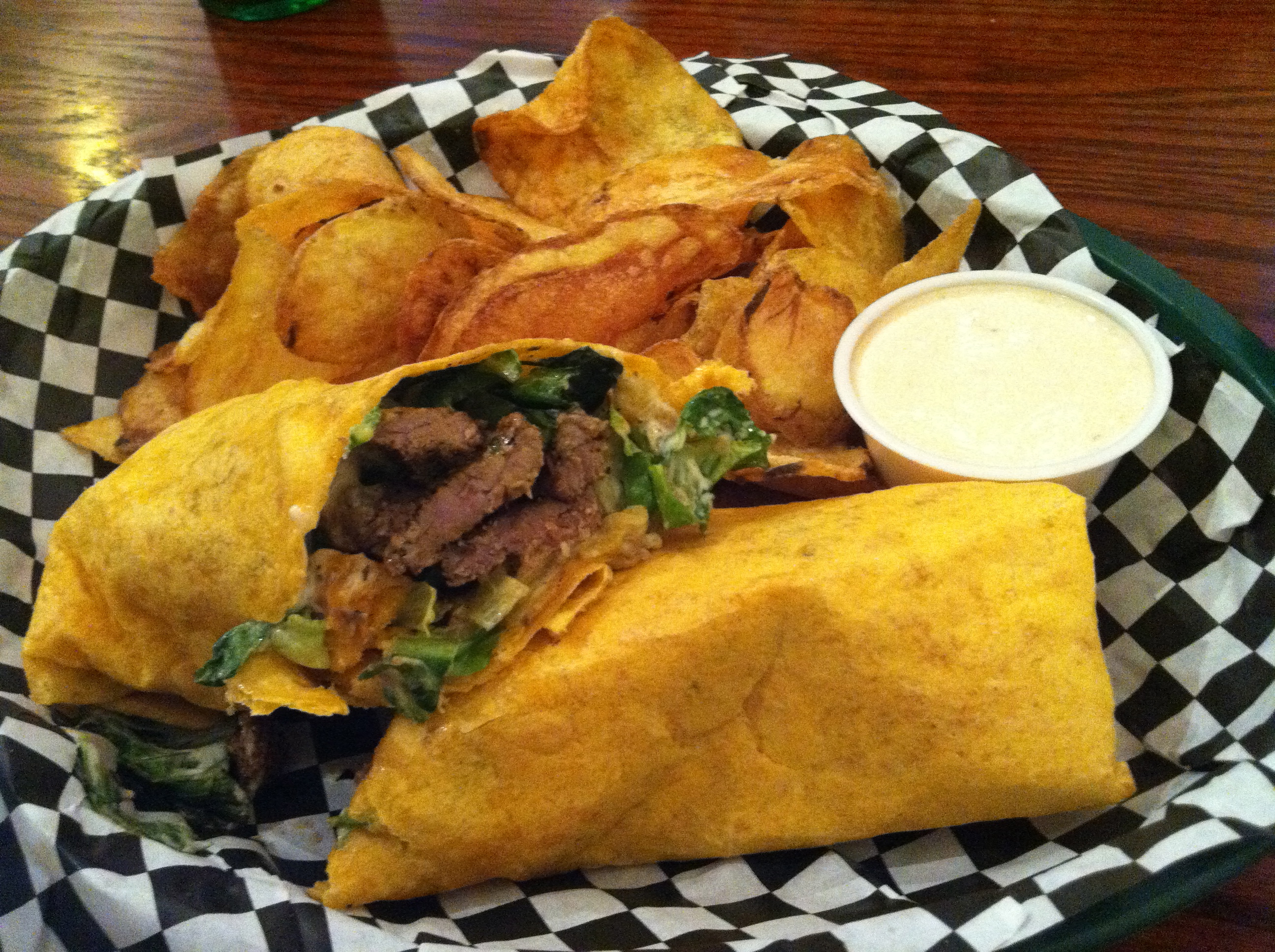 At TW, one can opt for either a wrap alone, or a platter, which is coupled with a choice of sides including homemade potato chips and this scrumptious dip, pictured above.  This was DZ’s selection, “The Bruiser” with blackened steak and crumbled bleu cheese: