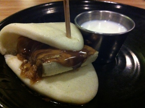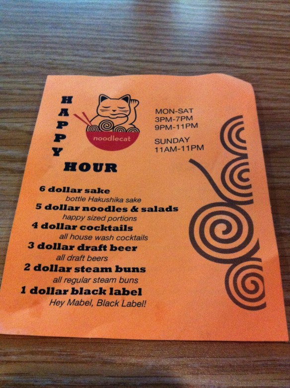 Let me warn you, I have a lot to say about Noodlecat, so for all my ADHD readers, (and you know who you are) looking for a quick answer to the question of whether or not Noodlecat is worth your time and money, here’s the big picture, a few recommendations to make the experience a success.  Having opened only last July, Noodlecat is taking a hit on UrbanSpoon, with a current approval rating of only 65%. First of all, if it’s your first time, go during happy hour (Monday thru Saturday, 3-7 p.m. and 9-11 p.m. or all day Sunday).  Why?  Because everything is cheaper and in smaller portions so you can try more.  Second, order the steam buns (especially BBQ pork), they’re great, and the Octopus Udon.  It’s spicy, flavor-packed, and awesome.  The Ramen dishes are, well, Ramen noodles.  So if you like mild flavors, go for it, but a lot of you will probably find them bland.  Finally, order the Chocolate Peanut Butter Banana steam bun.  If you followed my first suggestion and went on a Sunday or during happy hour, then this bun is $2 worth of sheer joy.