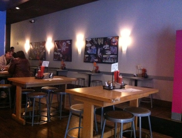 Inside, Noodlecat is unpretentious and casual, as any noodle house should be.  There are brightly colored walls, adorned with comic book style “cat art” presumably done especially for the restaurant which is very cool.  The old school furniture, (yes, literally, it’s school furniture that’s been salvaged from John Carroll University) takes you back to 9th grade biology.  It’s funky but functional, and fits into the decor pretty well.