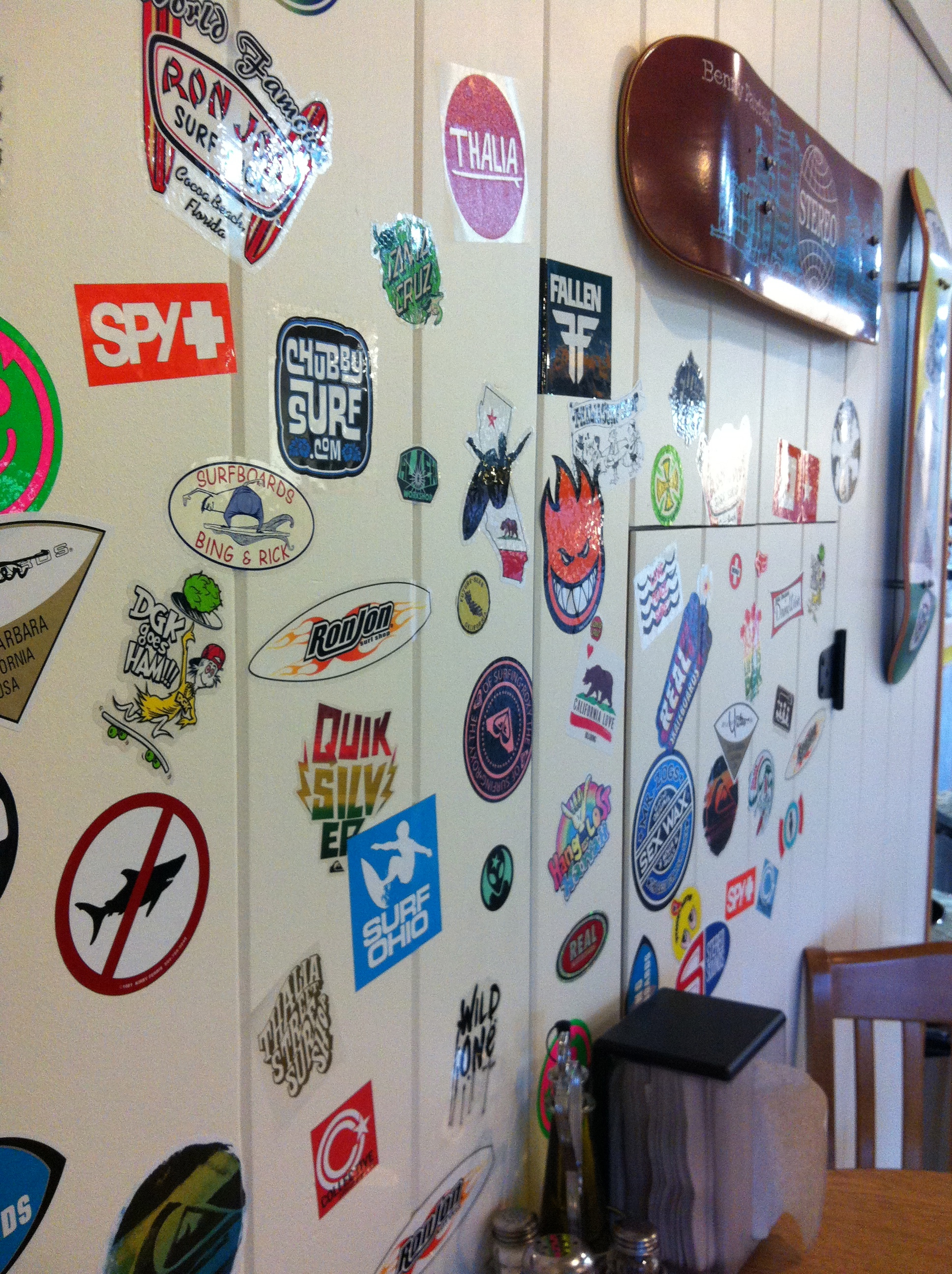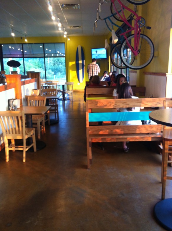 I didn’t take a photo of the outside of the building, but truth be told, you’re not missing much.  The only good thing going on outside is a sign referencing “fish tacos,” which is ultimately what drew me in.  Inside, is a different story entirely; you’re greeted with brightly colored walls with bikes and surf boards hanging on them, a semi-open kitchen, and California references galore.