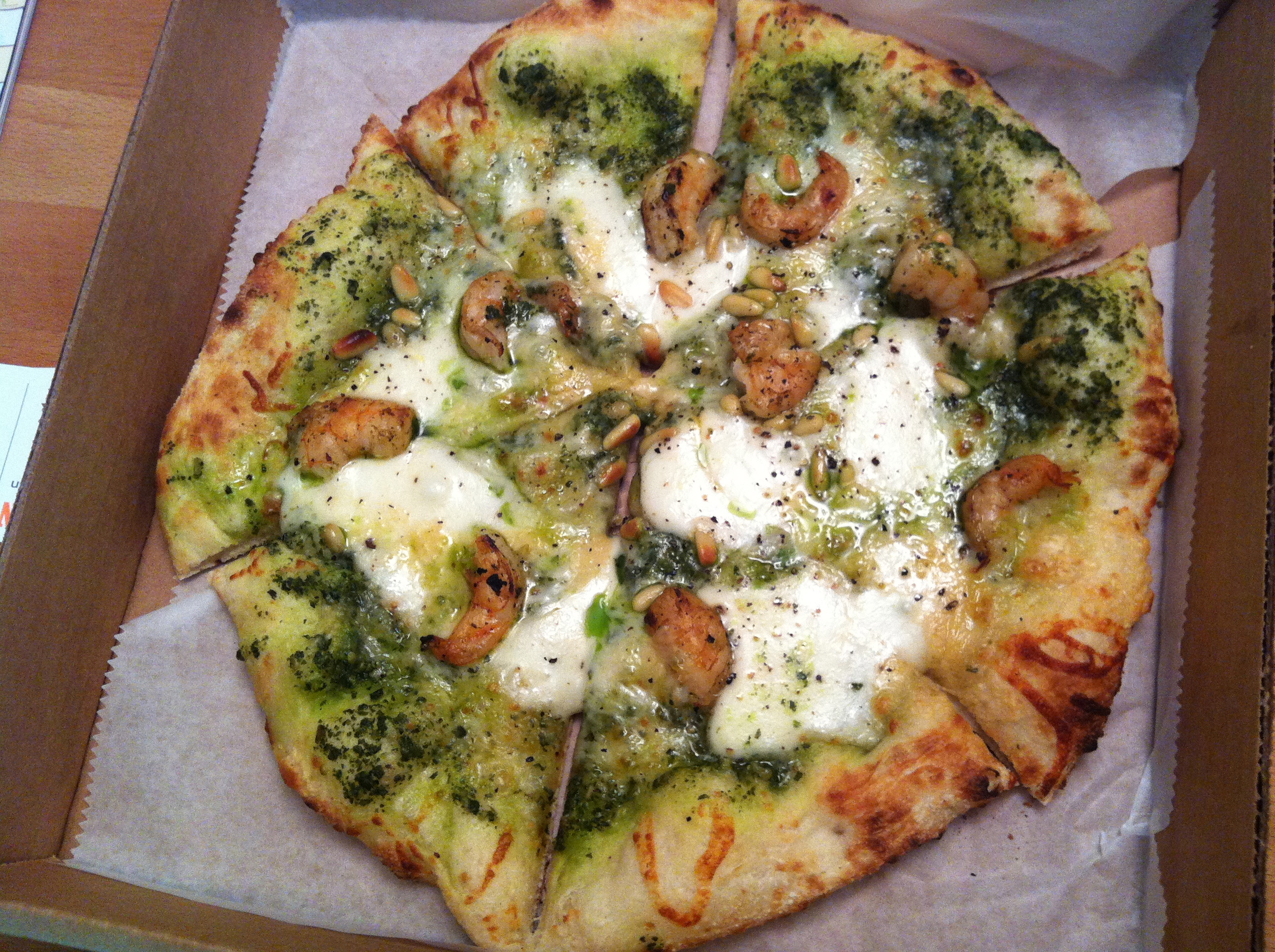 For our free pizza, I ordered the Santa Barbara Shrimp & Pesto, which has basil pesto (as the sauce), monterey jack, fresh mozzarella, grilled shrimp, pine nuts, Parmesan, and cracked black pepper.  I could barely get this thing home – the aromas filling my car were making me want to rip open the box and inhale a slice.  Somehow I managed to refrain.  When I got home, it turned out to be all that the smells promised to be…..I loved the pesto and pine nuts, such strong garlic flavors.  Fantastic.  Again, small issue that could easily be remedied: the pie could have benefited from more shrimp.  As you can see, there was on average only one piece per slice.  But other than that, a must try.