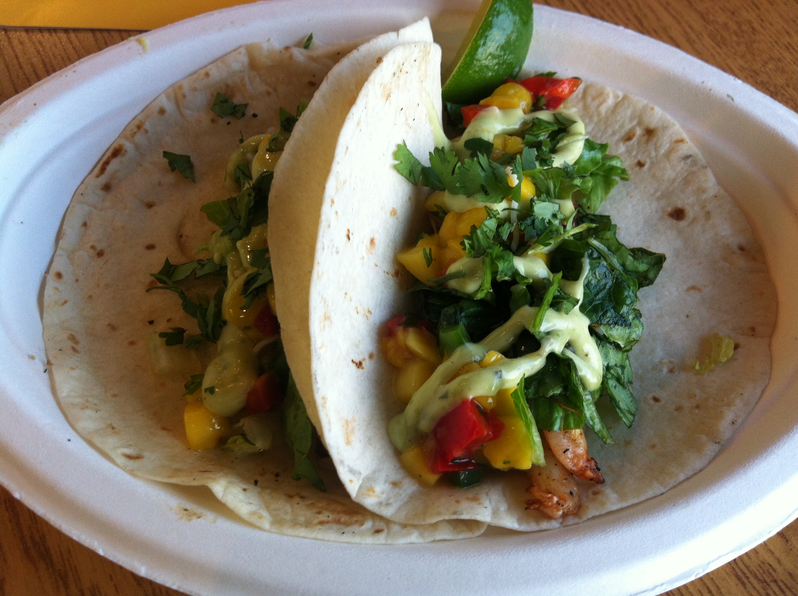 The menu is simple but interesting.  It boils down to tacos, rice bowls, pizzas, and salads.  The tacos and bowls are built basically the same, with shared options – the obvious difference being tortillas versus rice/beans.  First selection is fillings, choice of: mahi mahi, citrus grilled shrimp, salmon, grilled chicken, and veggie (red pepper, squash and zucchini).  Once you’ve decided on a filling, next you pick your “style” – baja, cabo, cantina, cali, or malibu – all of which consist of some combination of salsas (mango, tomato, or corn), sauces (avocado ranch, baja ranchero, garlic-lime, or roasted red pepper) and lettuce or cabbage.  I know, complicated, right?!  It’s really not.  Just seems that way the first time you order.