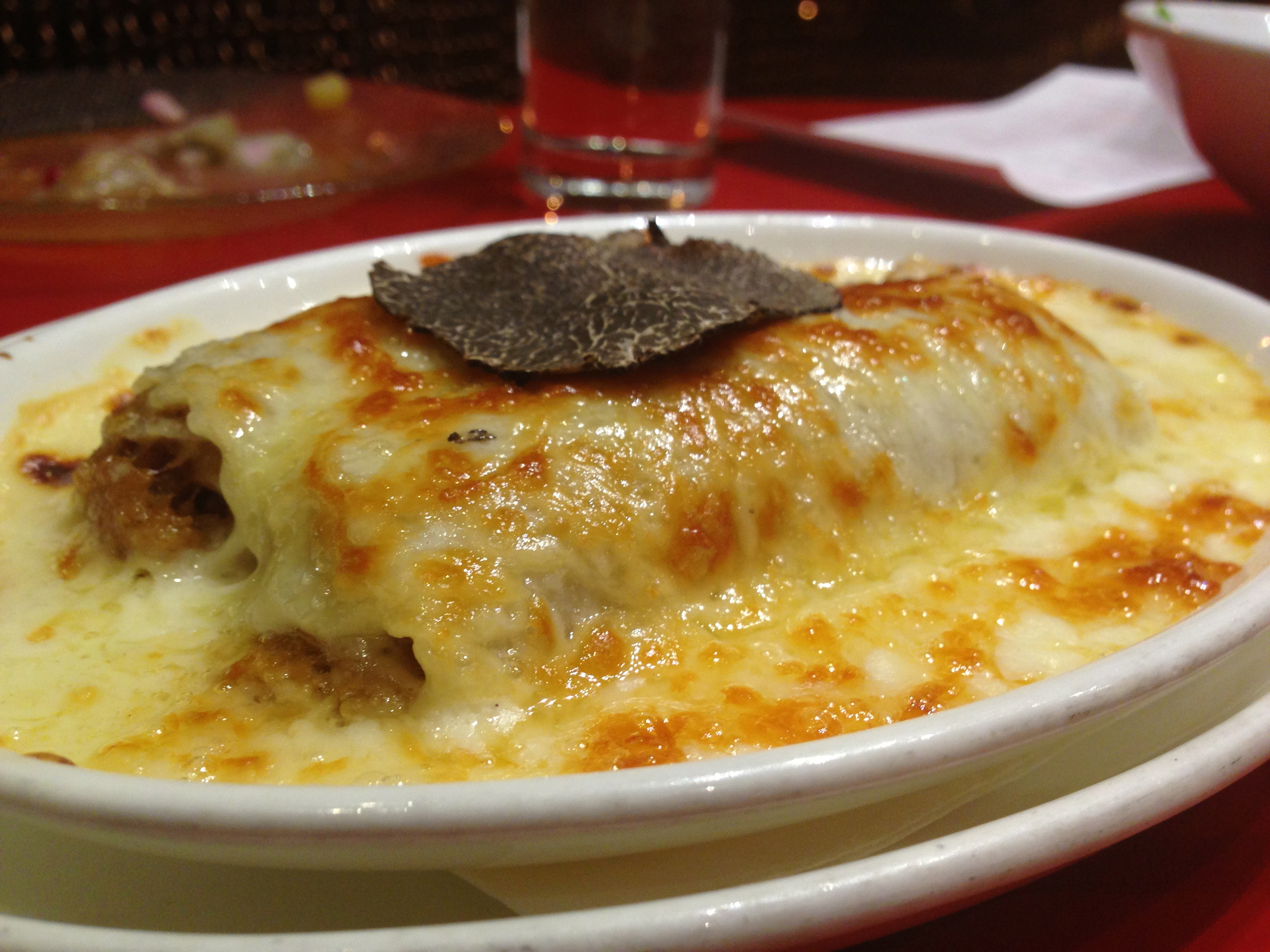 The next plate was my favorite of the night, (and a toss up between this and the potato foam with veal cheeks for Dave): pork and foie gras canelones with bechamel sauce and truffles. Words can’t describe how decadent this dish was….the bechamel, the flowing blanket of melted cheese. Best bite of the night, hands down.