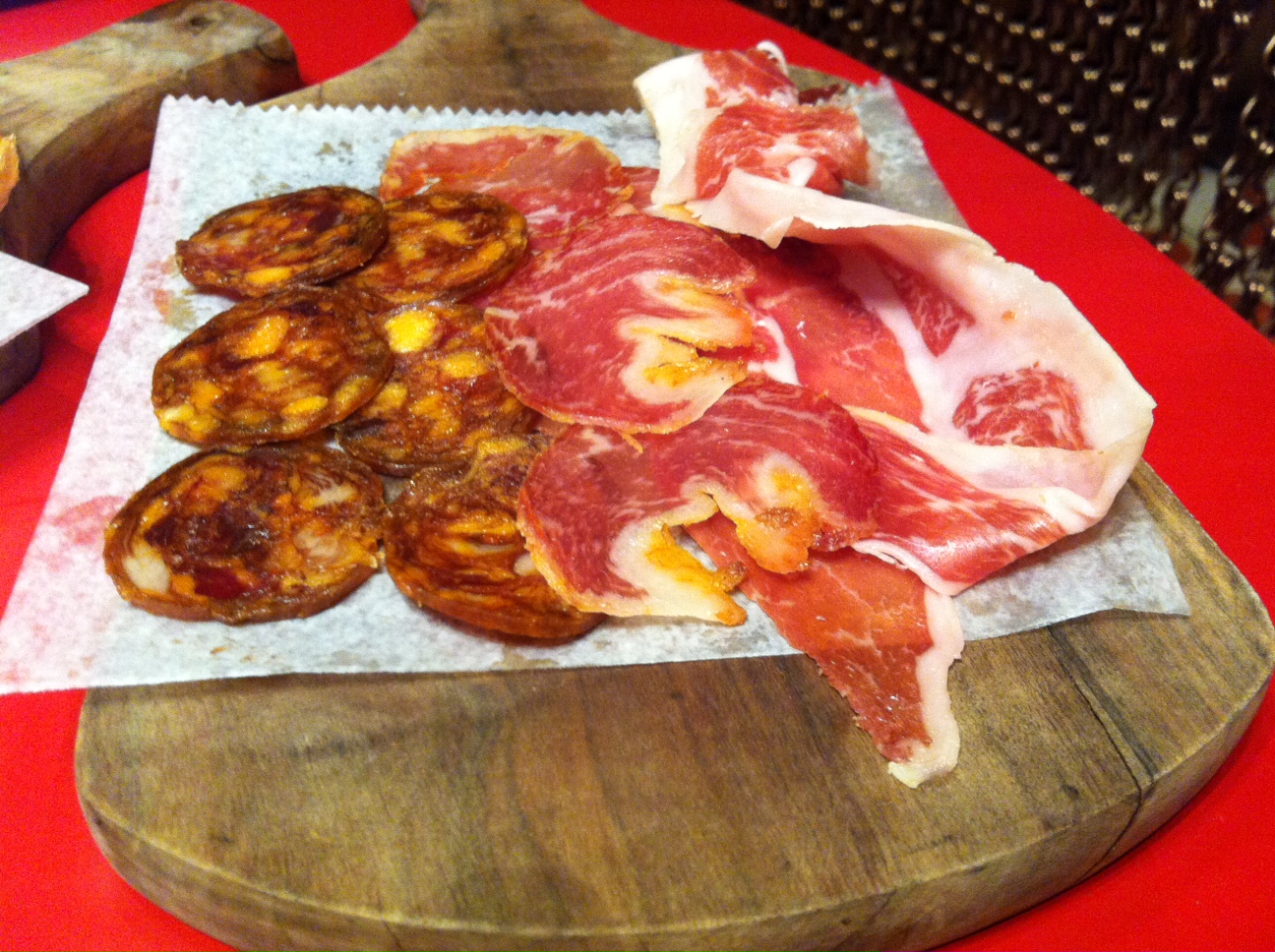 The final element to the first course was toasted bread brushed with fresh tomato and cured meats from black-footed Iberico pigs of Spain. Tasty buggers. We were topping the bruscetta with the meats and the result was delightful.