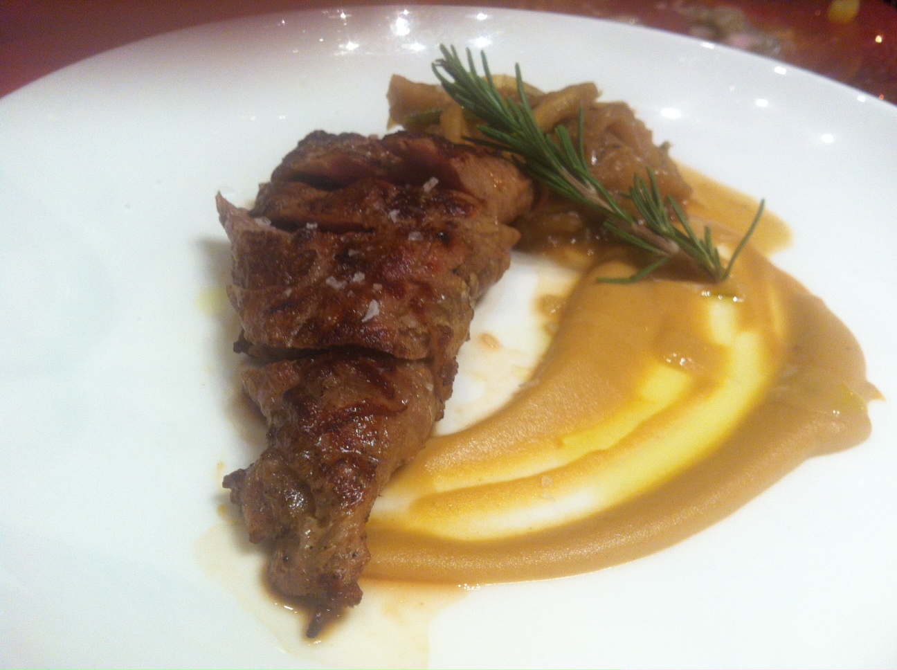 This picture of beauty is Maine shrimp carpaccio with pomegranate air. Yes, I said air. This was one of only dishes that we didn’t finish. Neither of us dug the shrimp carpaccio, or perhaps it was the orange colored sauce. The pomegranate air was intriguing; the dish would have benefited from more.