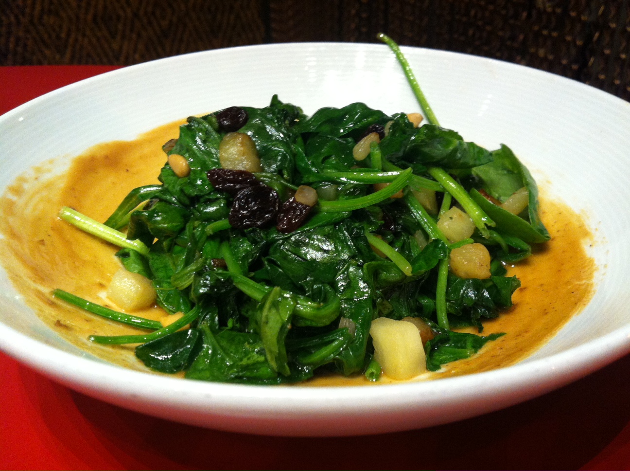 Greens to accompany our main course consisted of sauteed spinach with pine nuts, raisins, and apples. (This is the other dish we didn’t finish. Shame on us.)