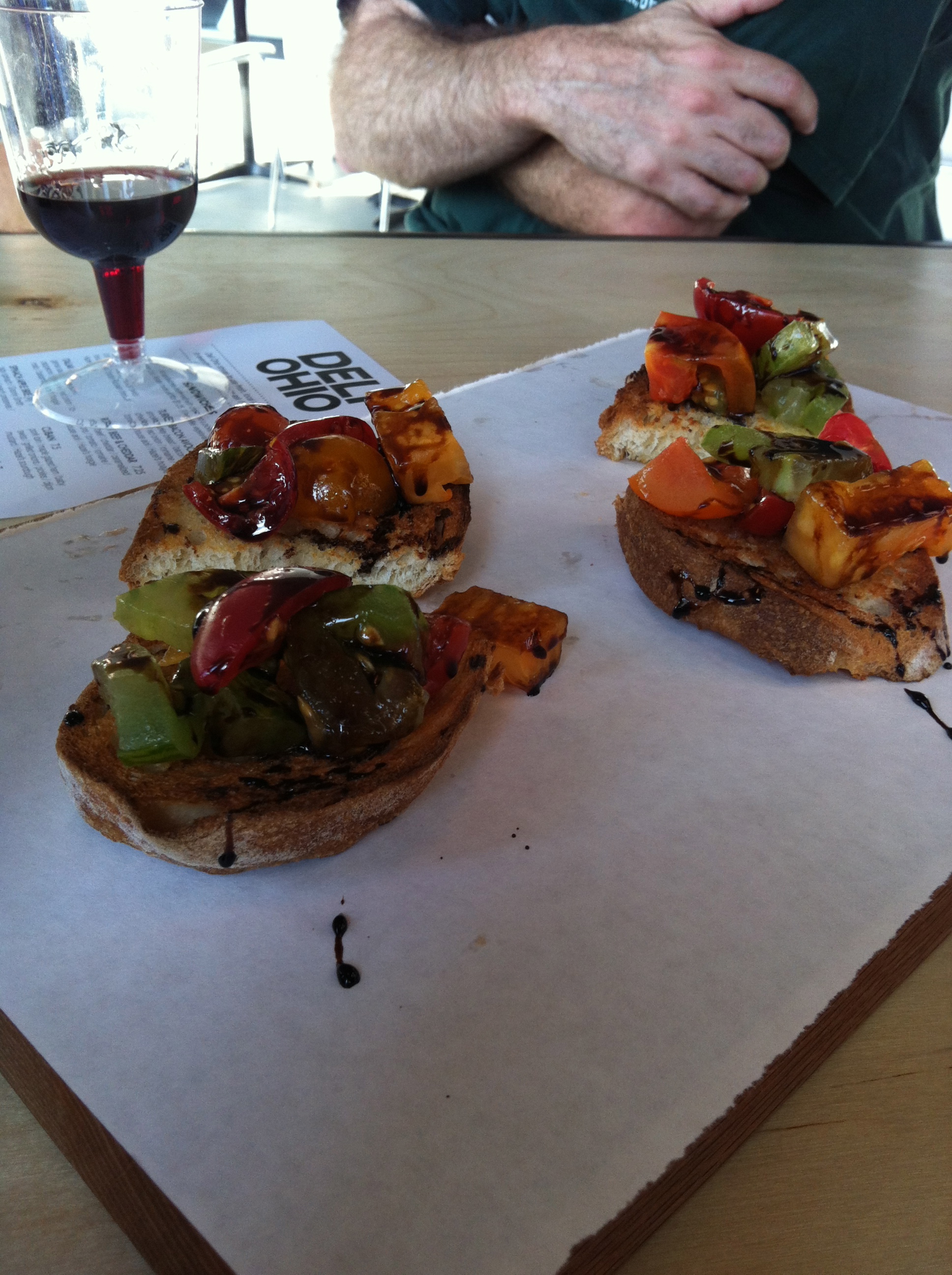 Yes, they have a regular menu of sandwiches, in true deli fashion. However, the owner is a creative type, and very passionate about his food, and therefore surprises his customers with delightful “perks” to the regular menu, like this bruscetta number (with wonderfully sweet heirloom summer tomatoes, most likely a product of local Breezy Hill Farm)…..this was my first exposure to Deli Ohio this summer. [Side note: the classy plastic vessel pictured above was NOT supplied by the deli. No, that would be our addition to the party, since Deli Ohio is BYOB, or BYOW, as it were. Oh yessss.]